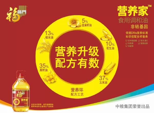 作为中国粮油行业的龙头企业,中粮福临门始终勇挑粮食安全和食品安全的重任,基于对消费者长期的深入了解,联合权威机构、高校,打造出符合《中国居民膳食营养素参考摄入量(2013版)》(DRIs)的新一代福临门营养家食用调和油,营养升级的同时在业内首次进行营养成分和配方比例的“双公开”。针对调和油市场品质良莠不齐,配方不透明等痛点,福临门营养家的首次“双公开”很好解决了消费不透明现象,或将推动调和油行业公开透明时代的到来。